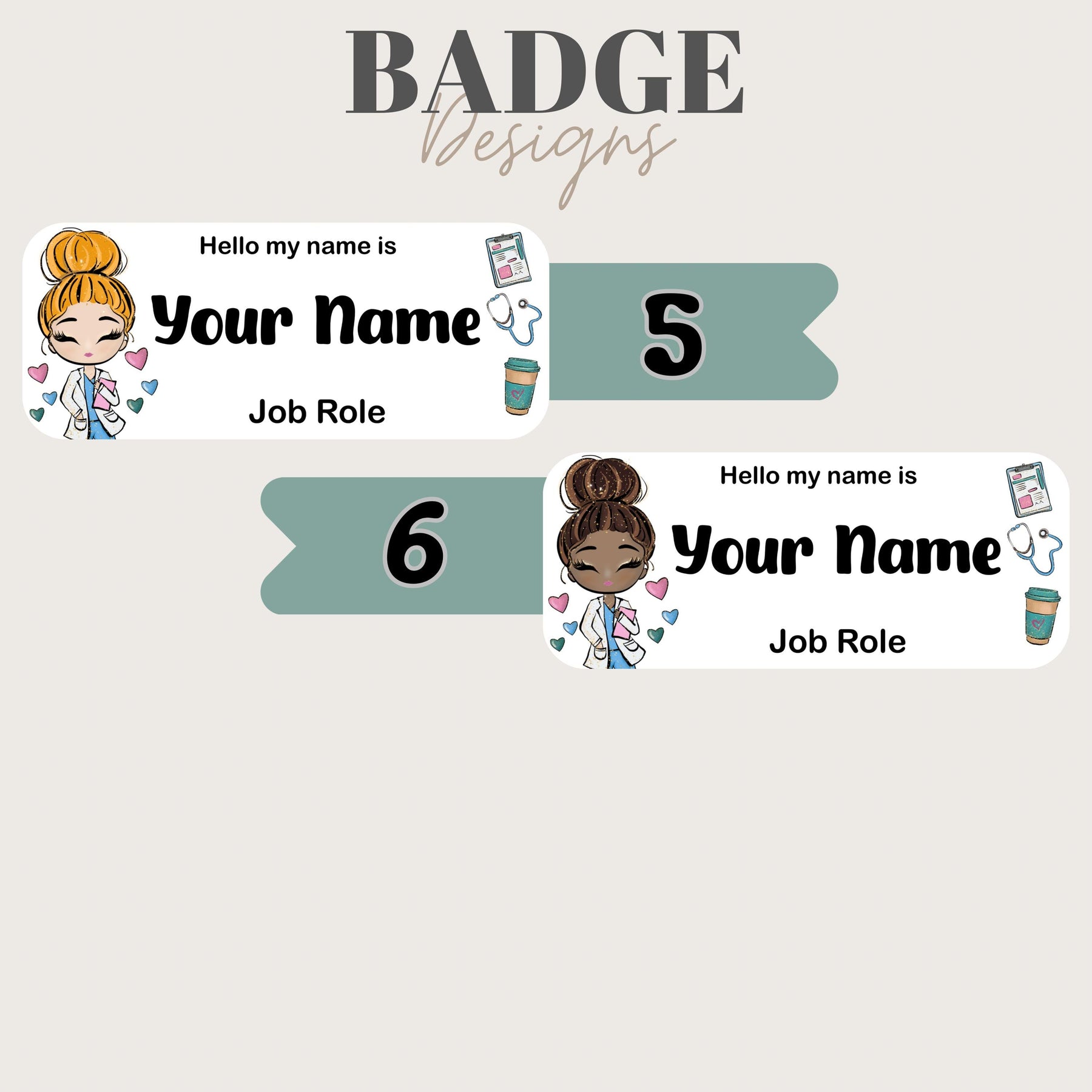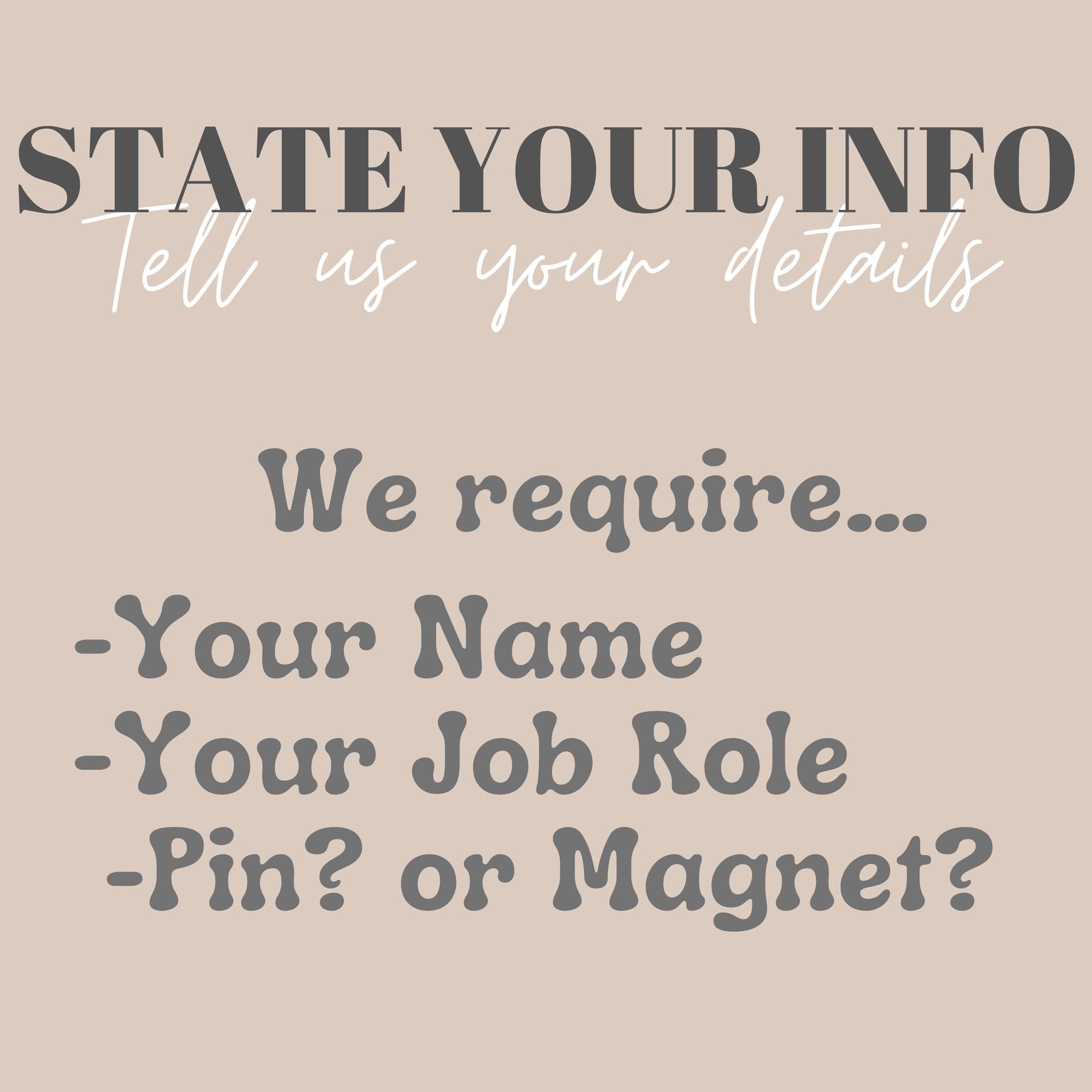 Badges all require personalisation. Please type clearly what is required such as name and job title. e.g. Sophie, Registered Nurse